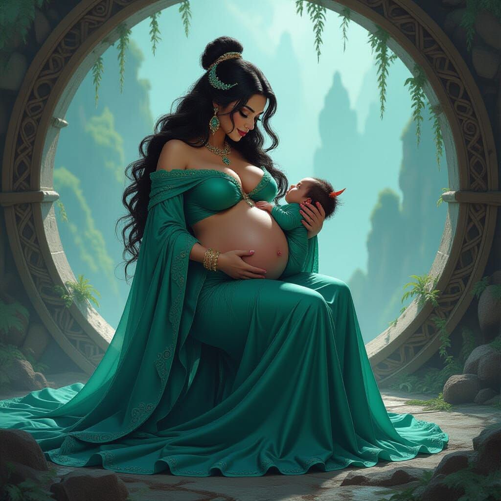 This image shows a curvaceous woman in flowing green and blue robes giving birth to a baby dragon. The scene is rich with intricate, mystical details and a dark, fantastical atmosphere in a fantasy art style.