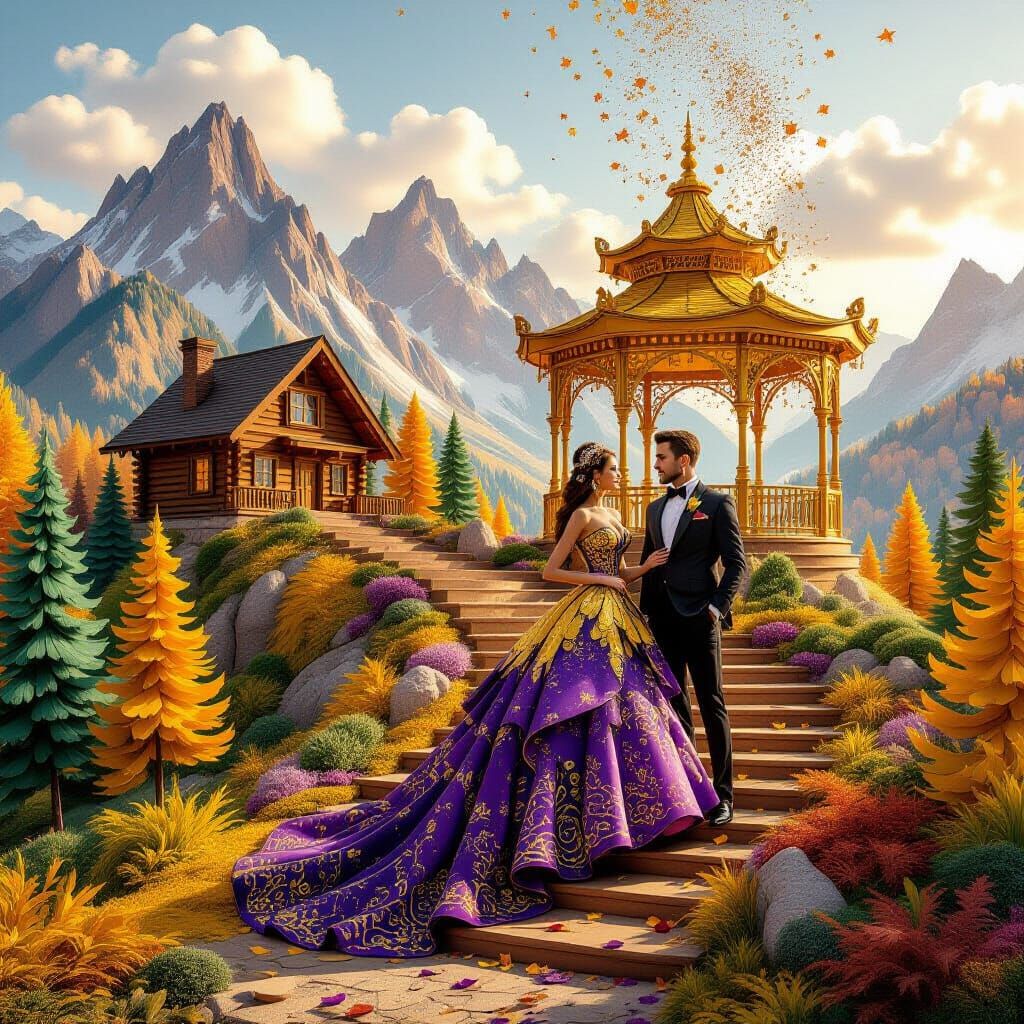 This image showcases a surreal landscape meticulously crafted from colorful wood shavings. It features mountains, a cabin, trees, and a gazebo, with a couple adorned in matching attire.