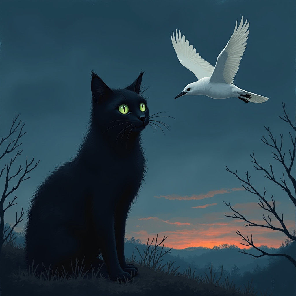A striking picture of a black cat with green eyes, contrasted by a white crow in flight. The image evokes a whimsical and dreamlike quality with moody, atmospheric colors.