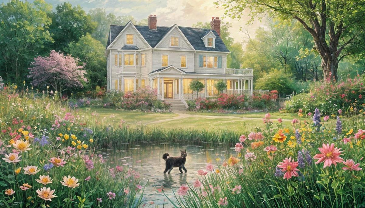 A serene view of a white Victorian house nestled in nature. The scene features a pond, meadow, and colorful flowers, painted with intricate details in an ethereal, cinematic style.