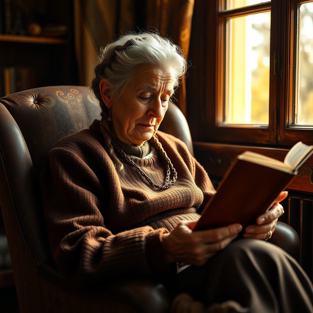 A striking picture of an elderly woman with elaborate braids reading a book in a sunlit room. The image evokes a nostalgic and melancholic mood using sharp focus and soft, golden light.