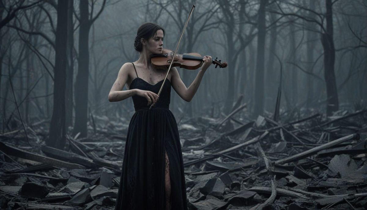 A dramatic image shows a woman in a black gown standing in a ruined forest. Embers glow in the air as she plays a mournful elegy on a black violin in the darkness.
