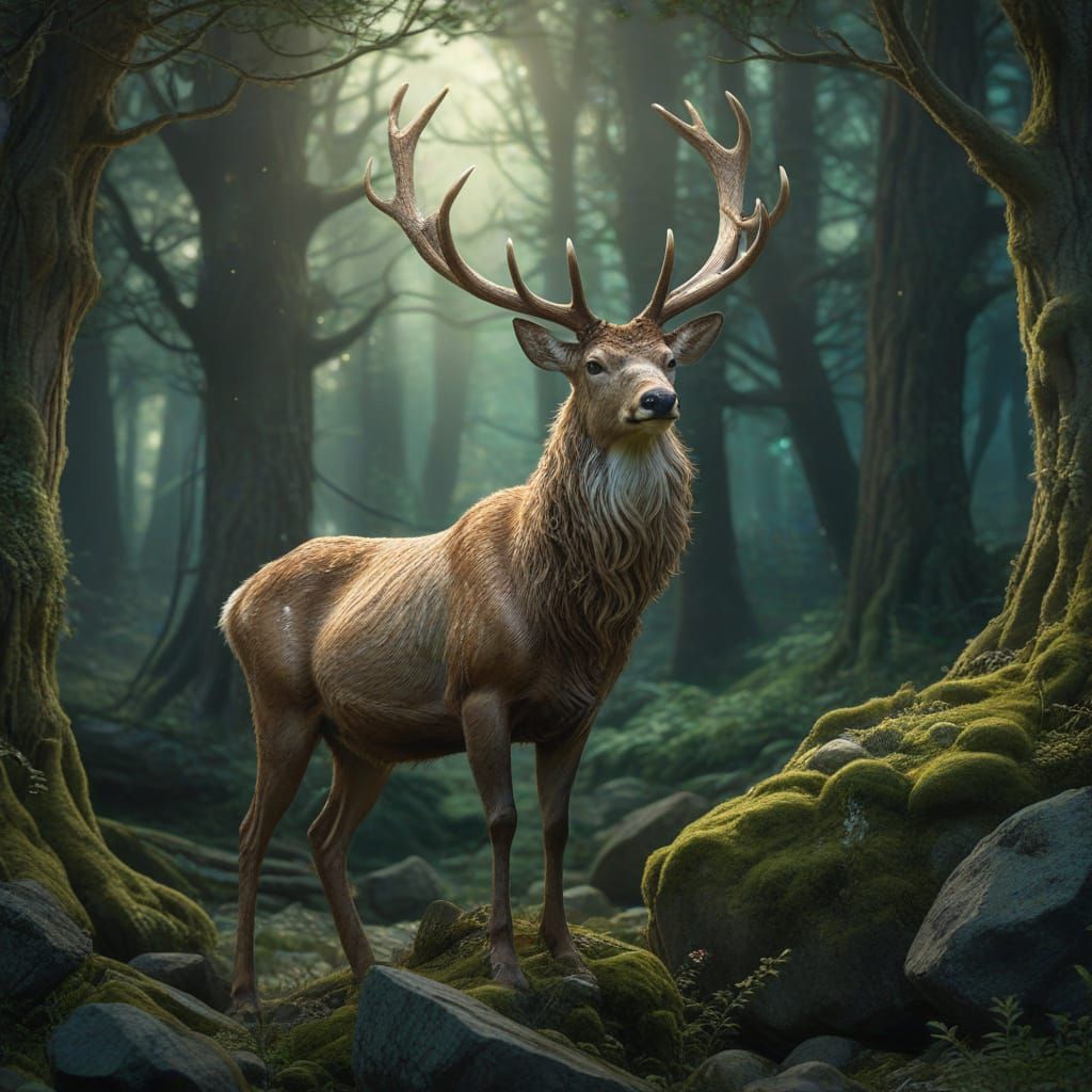This detailed illustration showcases a regal stag with quartz antlers in a mystical, glowing valley. Rendered with soft, ethereal light, evoking a timeless fantasy atmosphere.