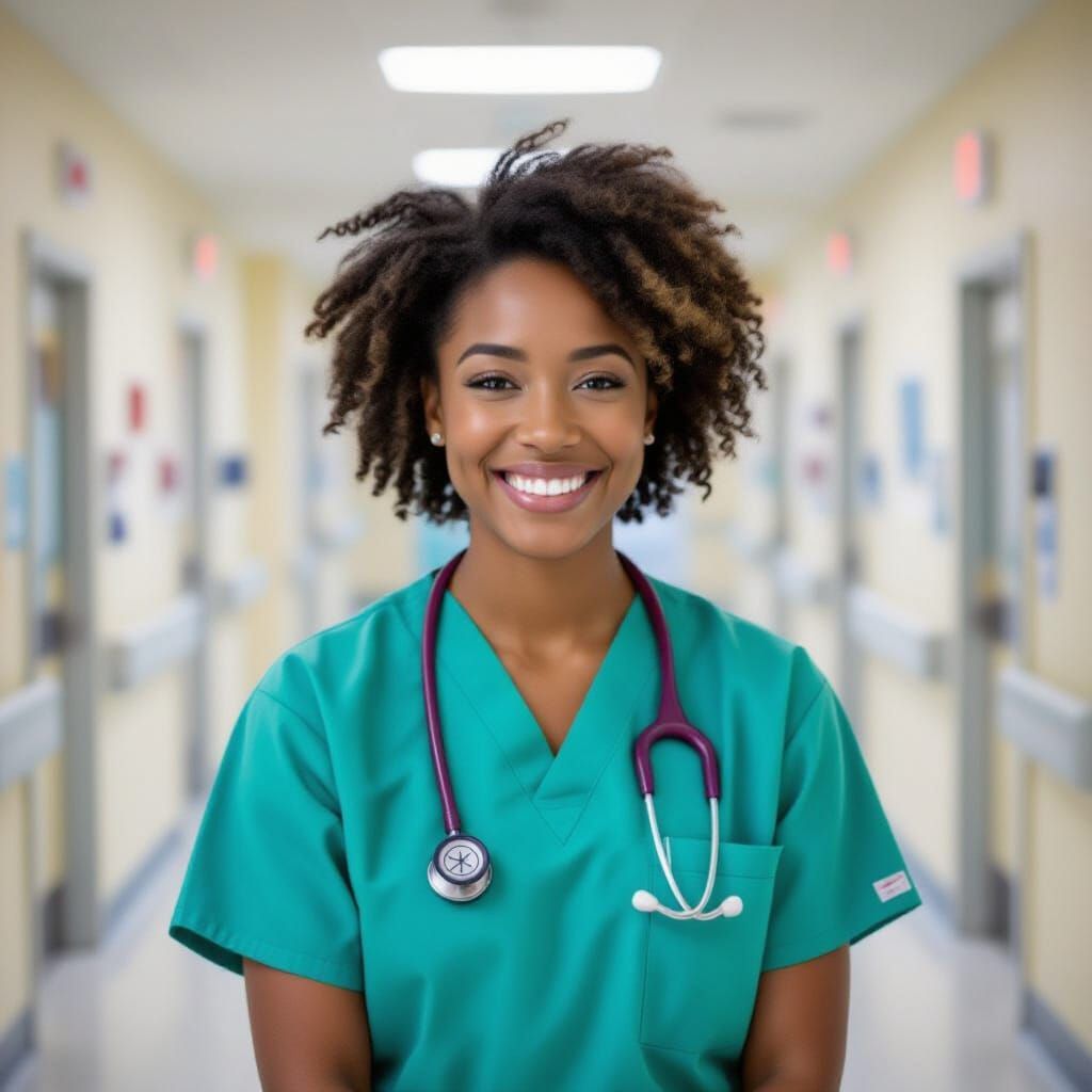 A friendly caregiver with a stethoscope stands in a vibrant hospital hallway. This illustration captures the whimsical, detailed, and modern kid-friendly style of classic children's book art.