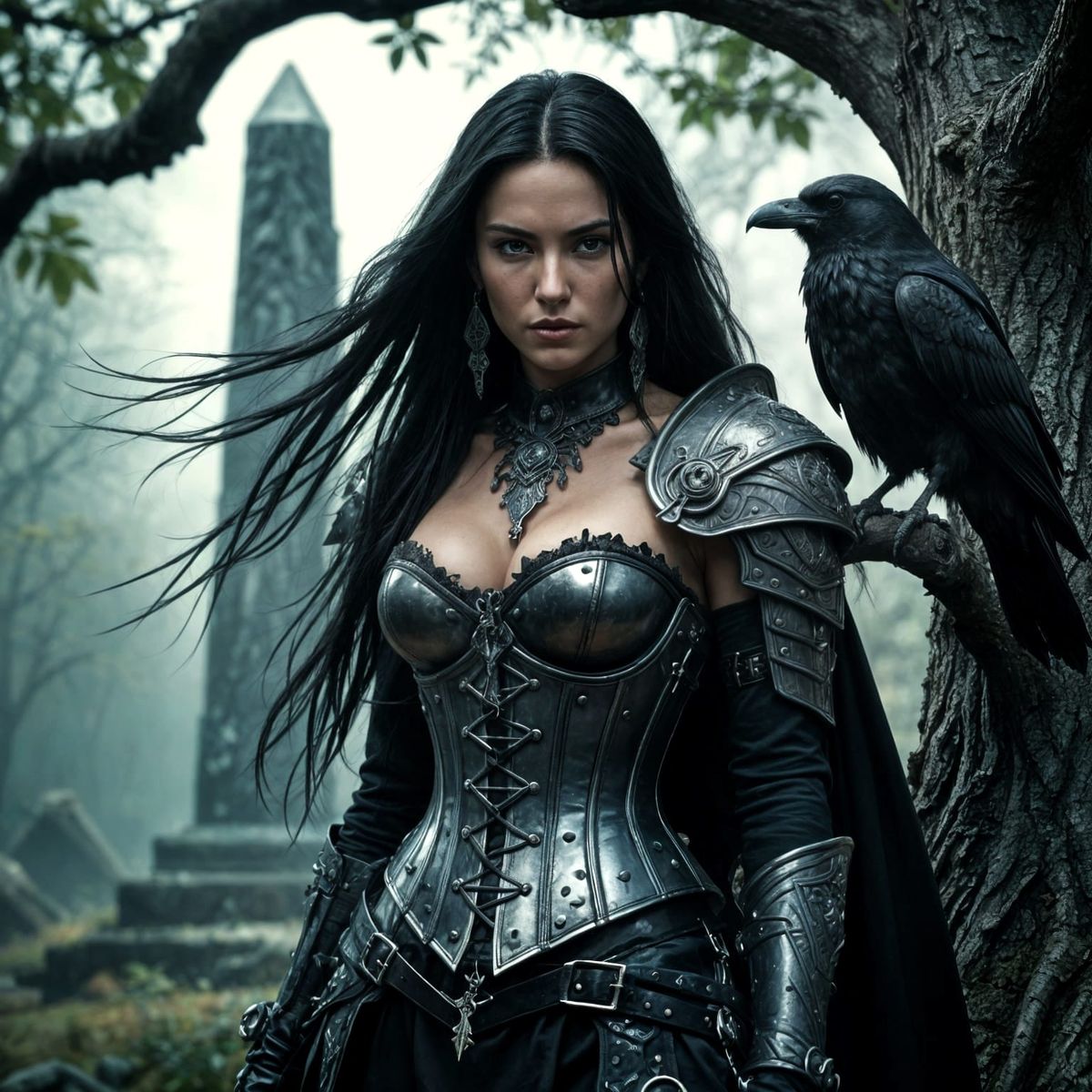 a intimidating female warrior with long black hair flowing in the wind , wearing a worn old steel corset armour with wear marks with runic and occult engravings, she also has a Raven as a familiar in a tree by her side , eerie enchanted forest with giant obelisk in the background