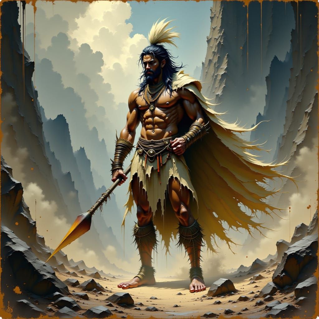 This image shows Kū, the Hawaiian god of war, in a smoke-filled battlefield. He wears traditional attire and wields a spear, depicted with dynamic energy and dark, mystical realism.