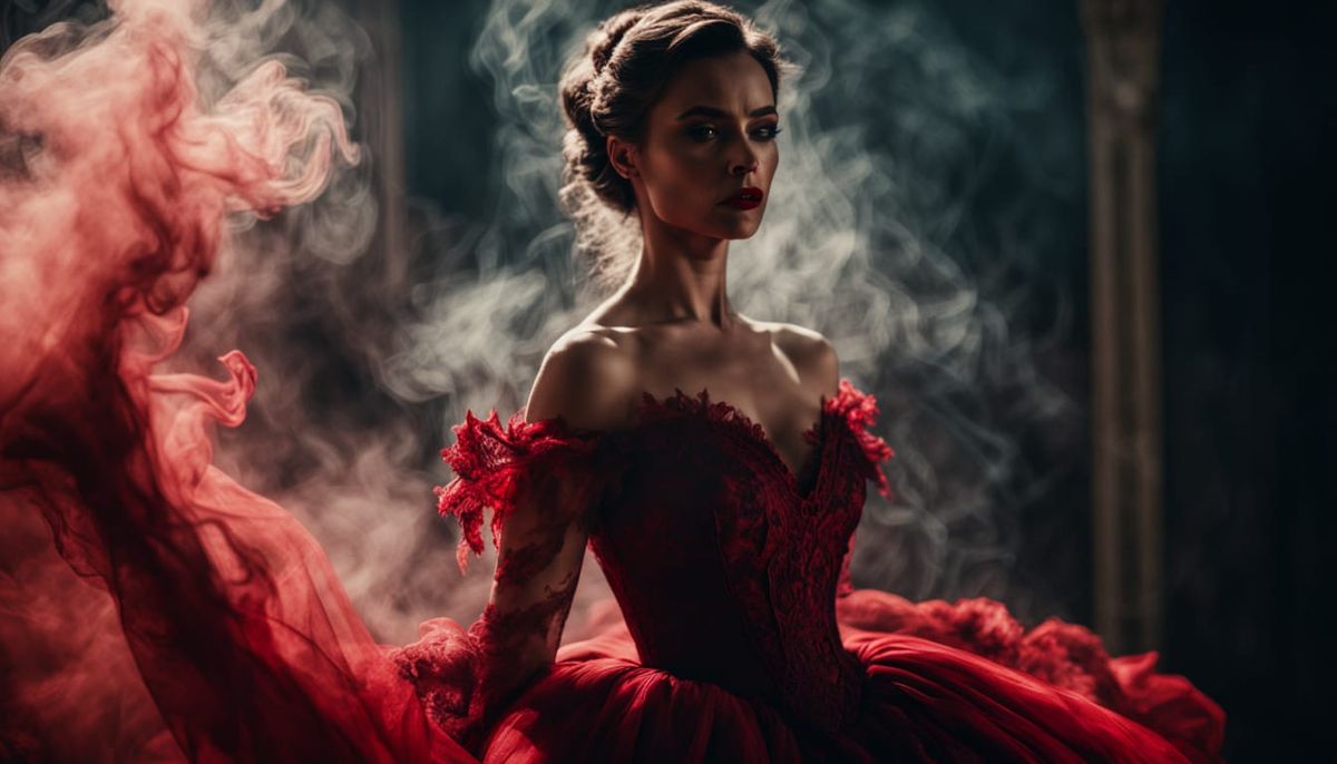 This image shows a woman in a voluminous red ballgown seemingly made of smoke. The portrait is a cinematic close-up with fine lace details, silk textures, high contrast lighting and a dark, moody atmosphere.