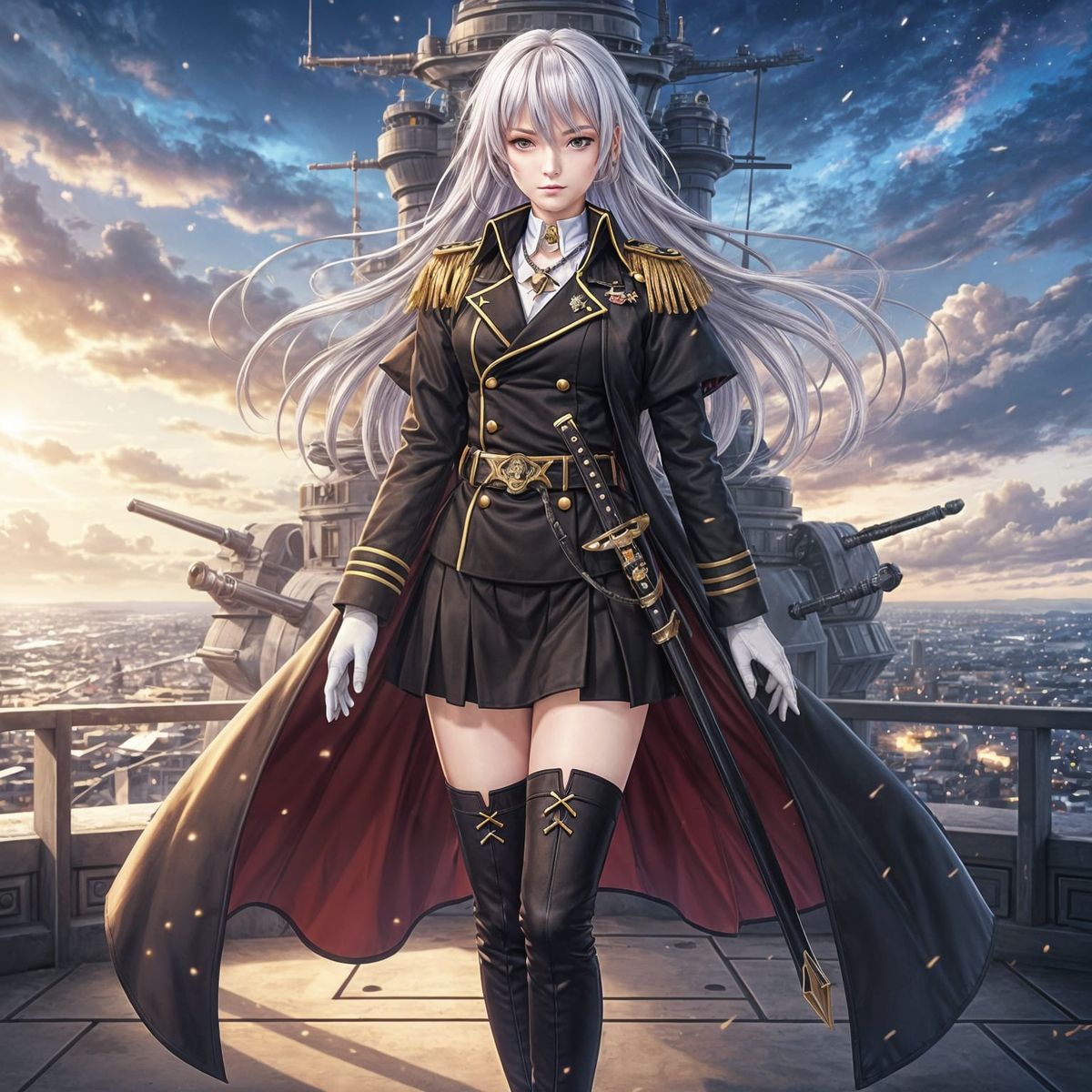 This image features a regal anime female admiral with long white hair and purple eyes, dressed in a black uniform with a golden belt and dramatic coat. She holds a sword, wearing gloves and jewelry, in a detailed anime style.