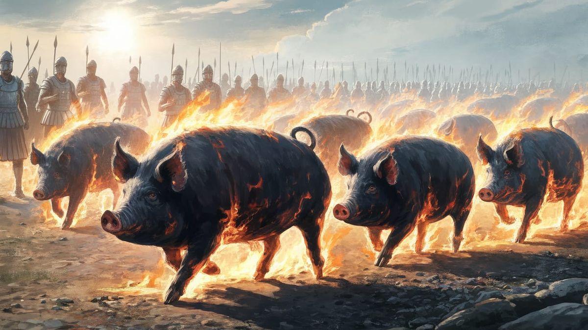 A chaotic scene of Roman legionaries fleeing from a herd of flaming, pitch-covered pigs on a sun-drenched Mediterranean plain, as the Roman tactic of using burning animals against war elephants is vividly depicted in a detailed, watercolor style.
