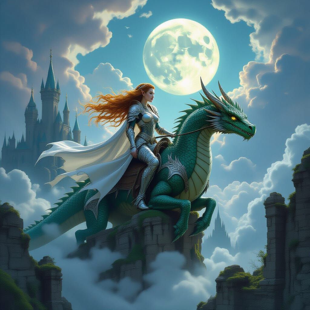 A fantasy illustration of a silver-armored elf riding an emerald dragon over ancient castle ruins under a moonlit sky. Features dramatic clouds and ethereal lighting.
