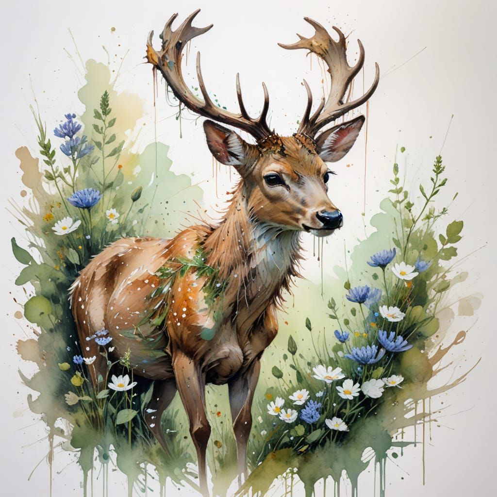 This serene image captures a peaceful deer grazing in a lush, springtime meadow, bathed in warm sunlight and surrounded by vibrant wildflowers. Watercolour techniques evoke a sense of ethereal beauty.