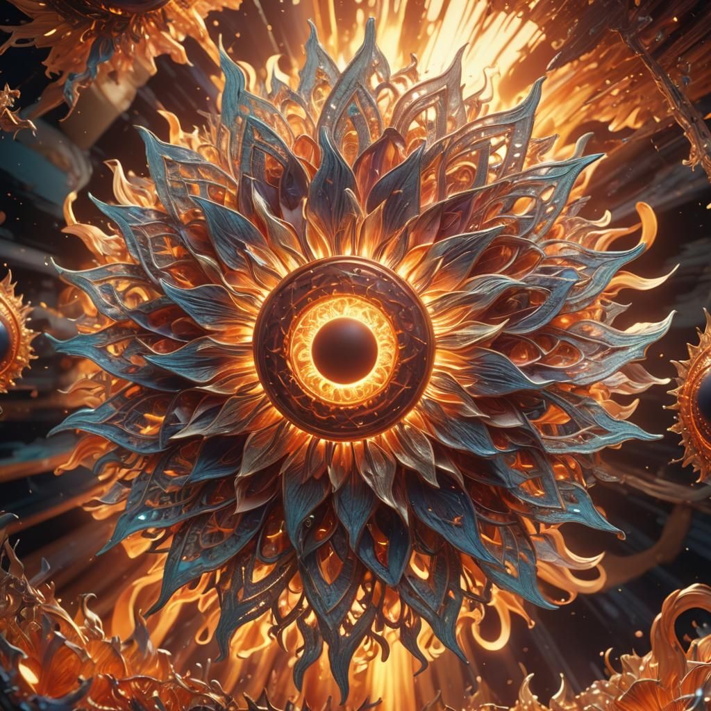 This image shows an exploding sun rendered as 3D anime concept art. The sun features intricate lace patterns, volumetric lighting, triadic colors, and swirling ethereal shapes, creating a dynamic and energetic atmosphere.