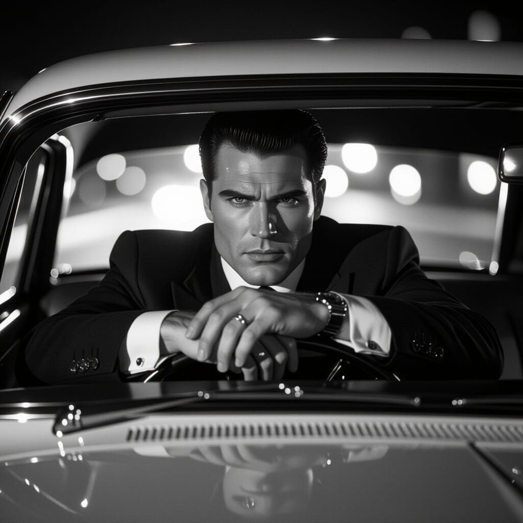 A striking picture of a handsome man in a luxury car. This black-and-white portrait features high-contrast lighting, dramatic shadows, and intricate details reminiscent of film noir, with volumetric lighting.