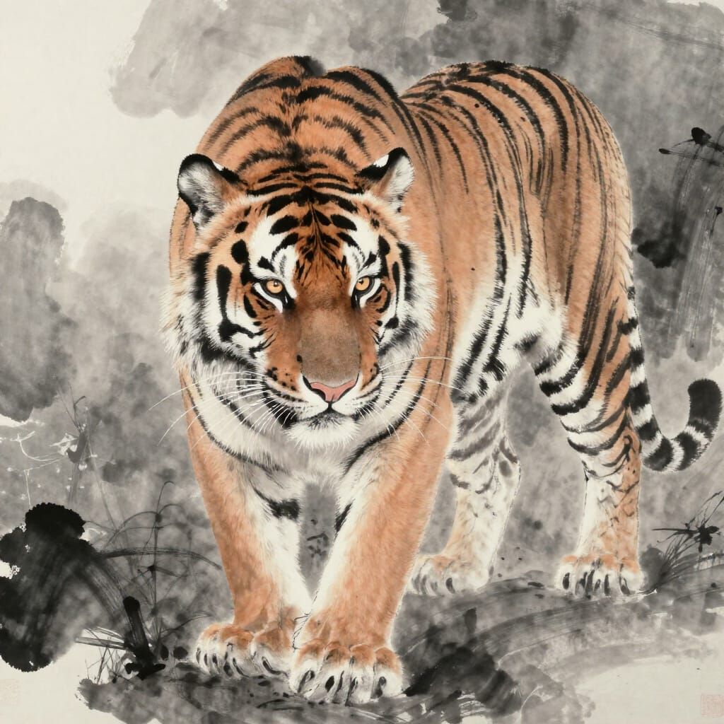 Tiger in the style of Sumi-e Japanese Ink Painting. Subdued washed pastel colors. Epic Surrealism Masterpiece by JK Patrick Woodroffe, Alexander Jansson. 88, Epic cinematic brilliant stunning intricate meticulously detailed dramatic atmospheric maximalist digital matte painting