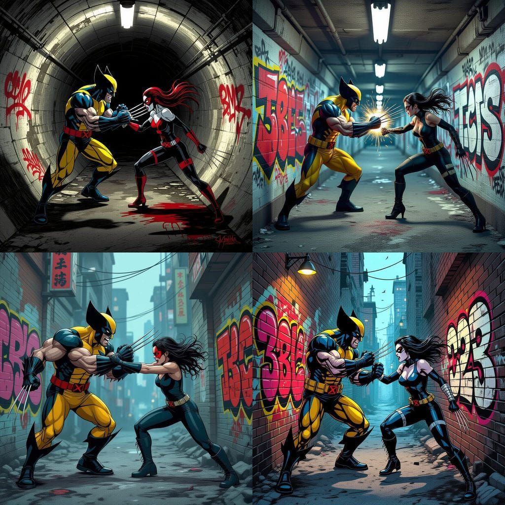 This image depicts Wolverine battling X-23 in a dark, horror-infused comic art style reminiscent of Tim Burton, with graffiti elements.