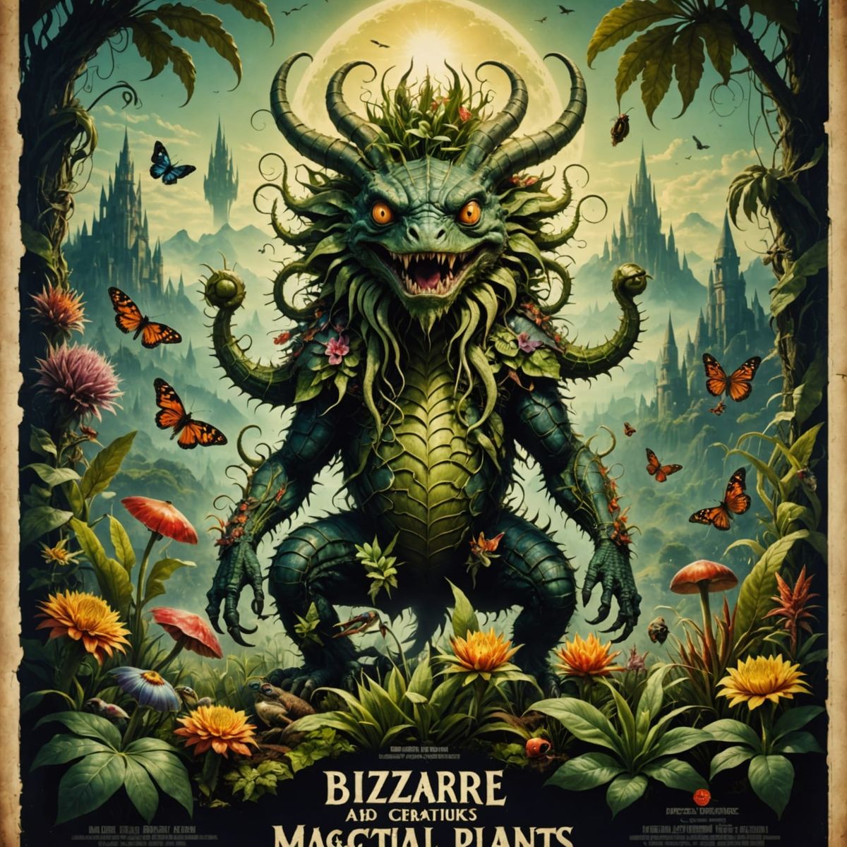 This image is a vintage movie poster featuring bizarre creatures and magical plants. It is rendered with intricate details, HDR, and sharp focus for a hyperrealistic and atmospheric look.