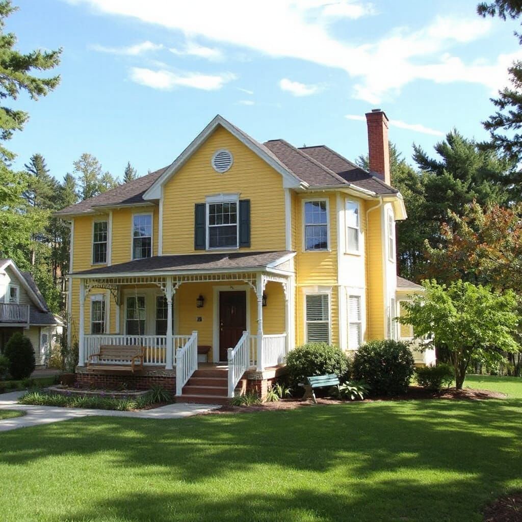 This image shows a yellow Victorian-style two-story house. The house features a wrap-around porch with a swing, surrounded by a lush forest and serene lakes.