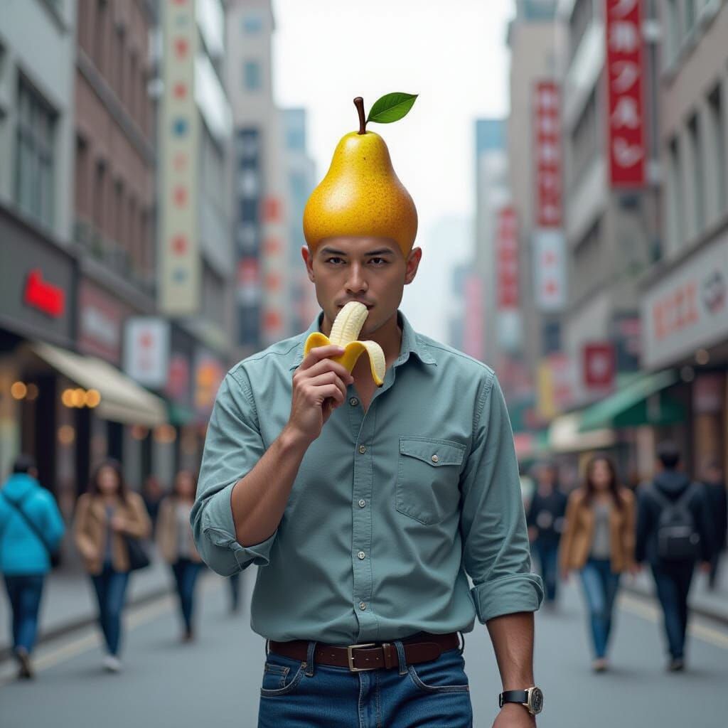 This image shows a bald man in casual clothes walking down a busy street while eating a banana. His head features a colorful pear tattoo in a playful, surreal and futuristic digital art style.