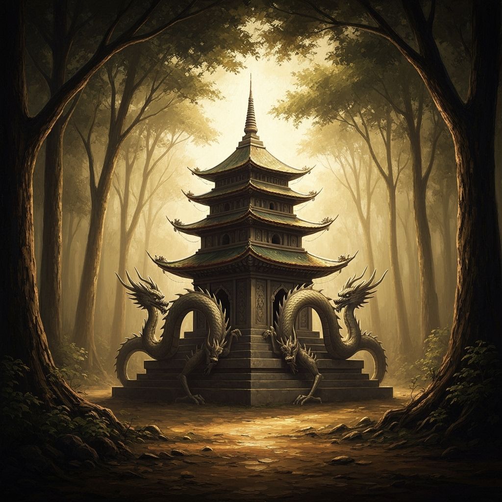 This image features an ancient pagoda watched over by two detailed dragons in a forest clearing, rendered in an impasto oil painting style with dappled sunlight and a nostalgic atmosphere.