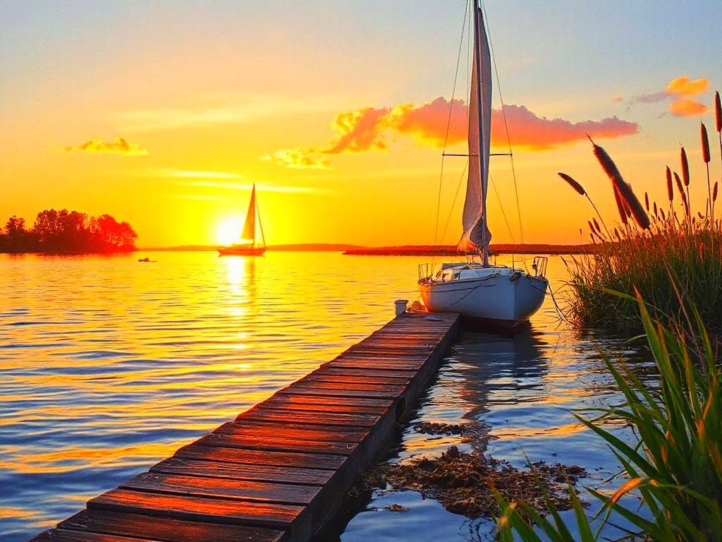 This image shows a sunset over an estuary, painted with soft, bleeding watercolor hues of gold, amber, and violet. An aged jetty leads to gentle water with sailboats and reeds, rendered in a dreamlike, maximalist matte painting style.