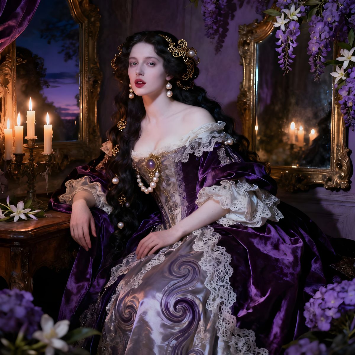 This image captures a mysterious 17th-century woman with dark hair adorned with gold and pearls, illuminated by candlelight. Rendered with Baroque opulence and chiaroscuro drama, evoking twilight hues.
