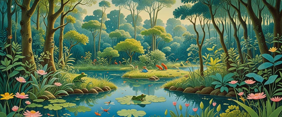 A vibrant folk art painting of a mystical forest glade filled with prehistoric plants and animals. The scene is rendered in soft, dreamy colors, depicting a serene pond under a clear blue sky.