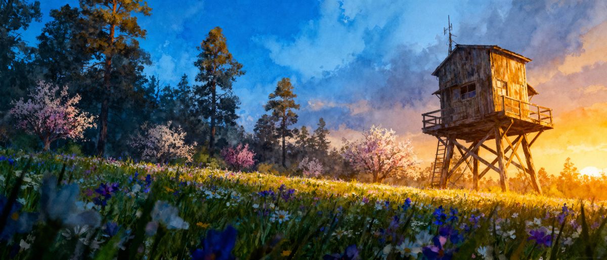 This image depicts a magical spring landscape bathed in warm sunset light. It features trees, wildflowers, and a rustic wooden cabin, rendered with hyperrealistic detail and a dramatic perspective.