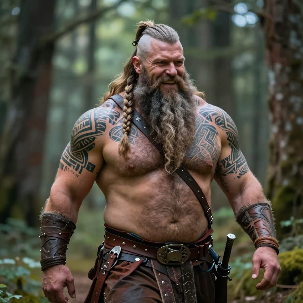 This image shows a hyperdetailed portrait of a muscular, bearded Viking man with intricate tattoos. Rendered with dynamic lighting and vibrant colors for a fantasy art style.