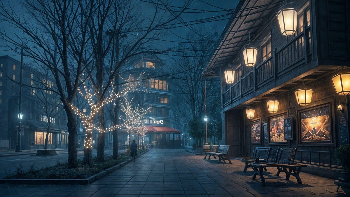 This image is a 3D anime concept art piece depicting a military park at night, exuding a cozy atmosphere and showcasing extremely detailed, ultrafine visuals reminiscent of high-end 8k resolution artwork.