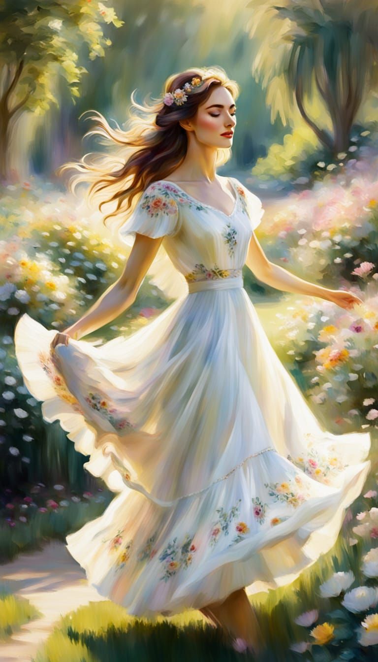 This image shows a young woman twirling in a sun-drenched garden, surrounded by vibrant flowers and delicate brushstrokes. Painted in an Impressionist style, with soft focus and warm, golden light.