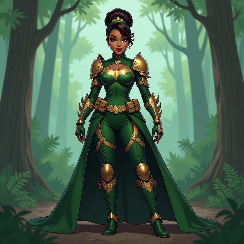 This image depicts Princess Tiana reimagined as a Gotham City vigilante. She wears a stylish armored suit in deep green, gold, and black, blending regal elegance with urban combat readiness.