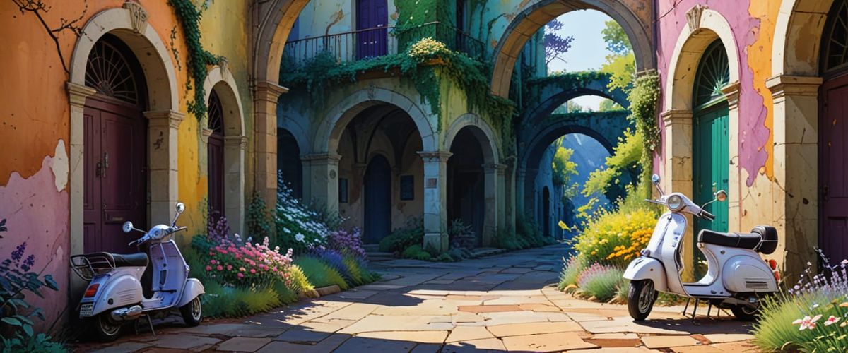 This image shows a bright and cheerful view of abandoned passageways with benches and a white Vespa. Mossy stone walls, arches, trees and flowers are rendered in watercolor and gouache, with volumetric lighting.