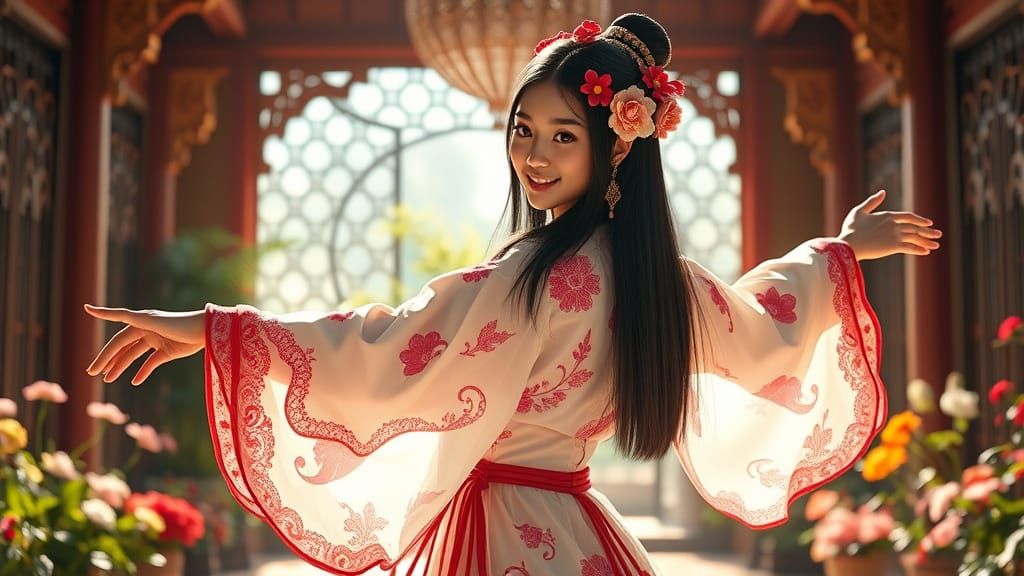 This image shows a serene and vibrant depiction of a young girl, adorned with elaborate floral hair ornaments, wearing a stunning translucent hanfu, set amidst a spacious harem with an indoor flower garden, in a style reminiscent of hyperrealistic digital art