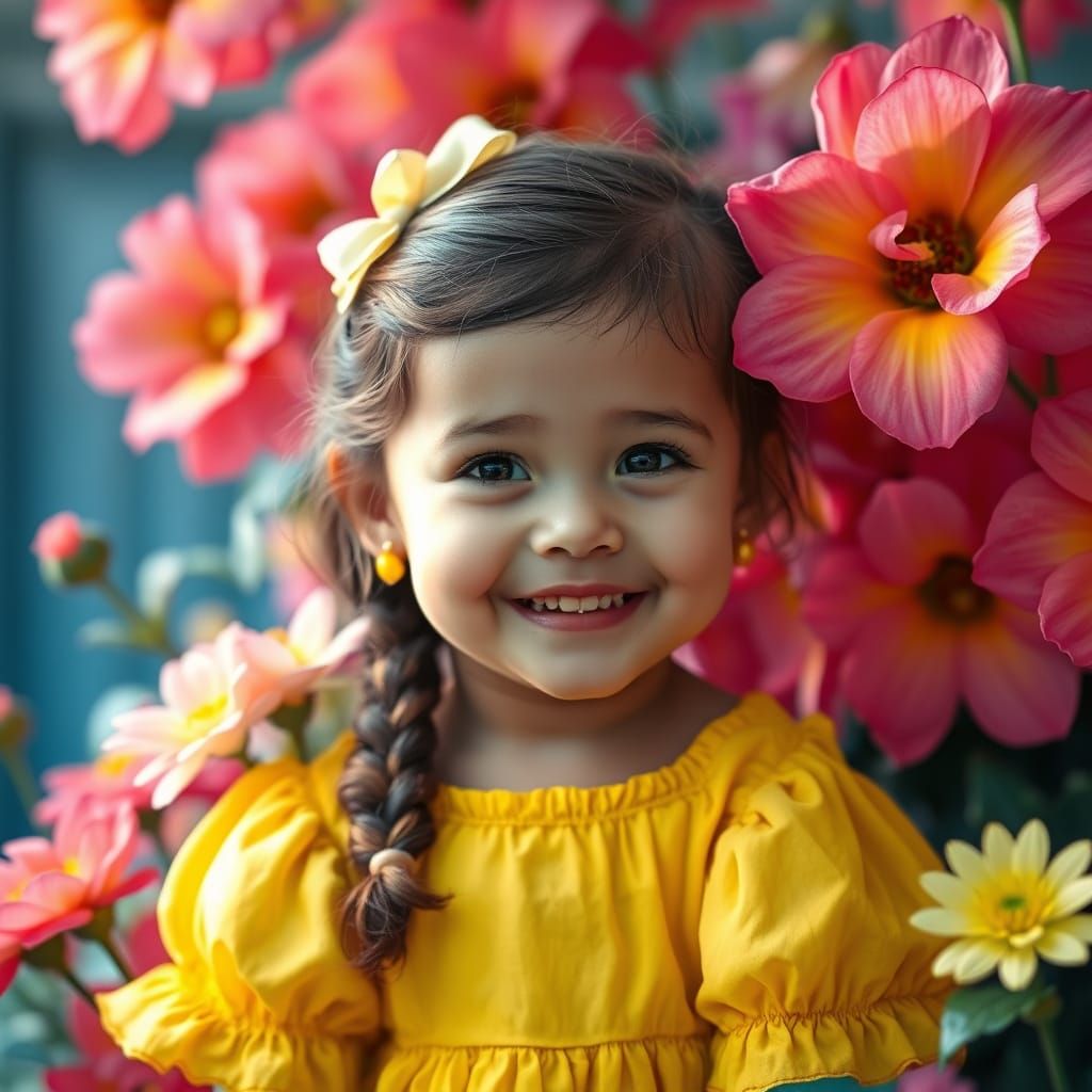 This image depicts a young girl with a radiant smile, surrounded by lush flowers in a scene reminiscent of a serene garden, with subtle hints of cinematic drama and playful color.