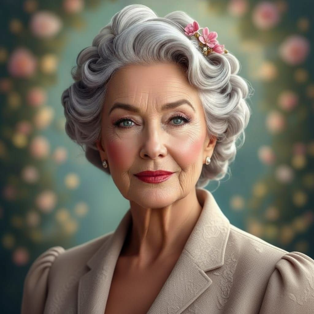 This 3D rendered image shows an elegant older lady with intricate details and unnatural vivid colors. The high-resolution artwork evokes strong emotions.