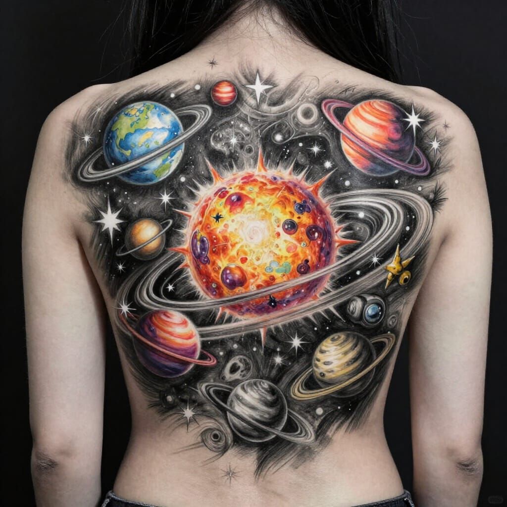 This image showcases a hyperdetailed charcoal drawing of a vibrant solar system tattoo on a woman's back, featuring colorful planets and cosmic elements with dynamic light and shadow.