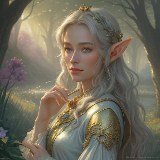 A close-up watercolor portrait of an elf bathed in warm sunlight. The image features soft, cinematic lighting, sparkling water droplets, and a dreamy, ethereal atmosphere.