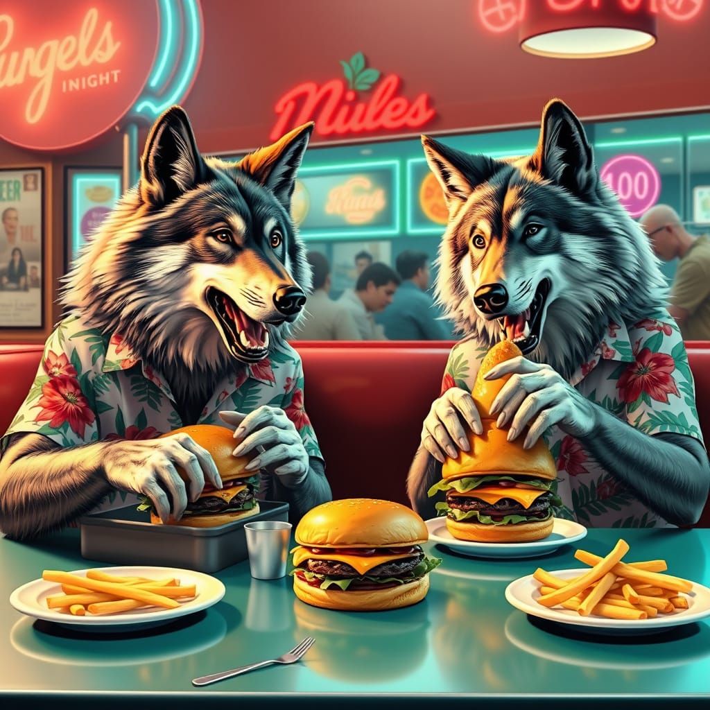This vibrant image captures a group of dire wolves dressed in colorful Hawaiian shirts, enjoying cheeseburgers at a nostalgic 1950s diner, blending wild and whimsical elements in a fun and playful scene