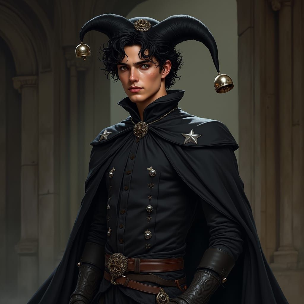 This image depicts a charismatic young clown set in a mysterious medieval environment, with intricate details reminiscent of comic book art and illustrations by Simon Bisley and Lee Bermejo.