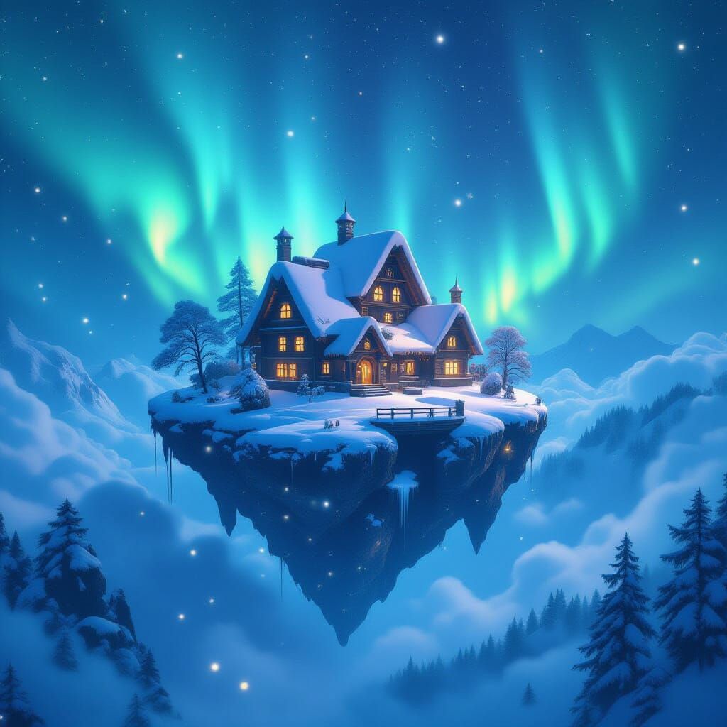 This image depicts a fantastical, floating island village drifting through a vibrant nebula filled with stardust and aurora. Gentle snow falls in this dreamlike scene, rendered with intricate detail and soft, glowing light.