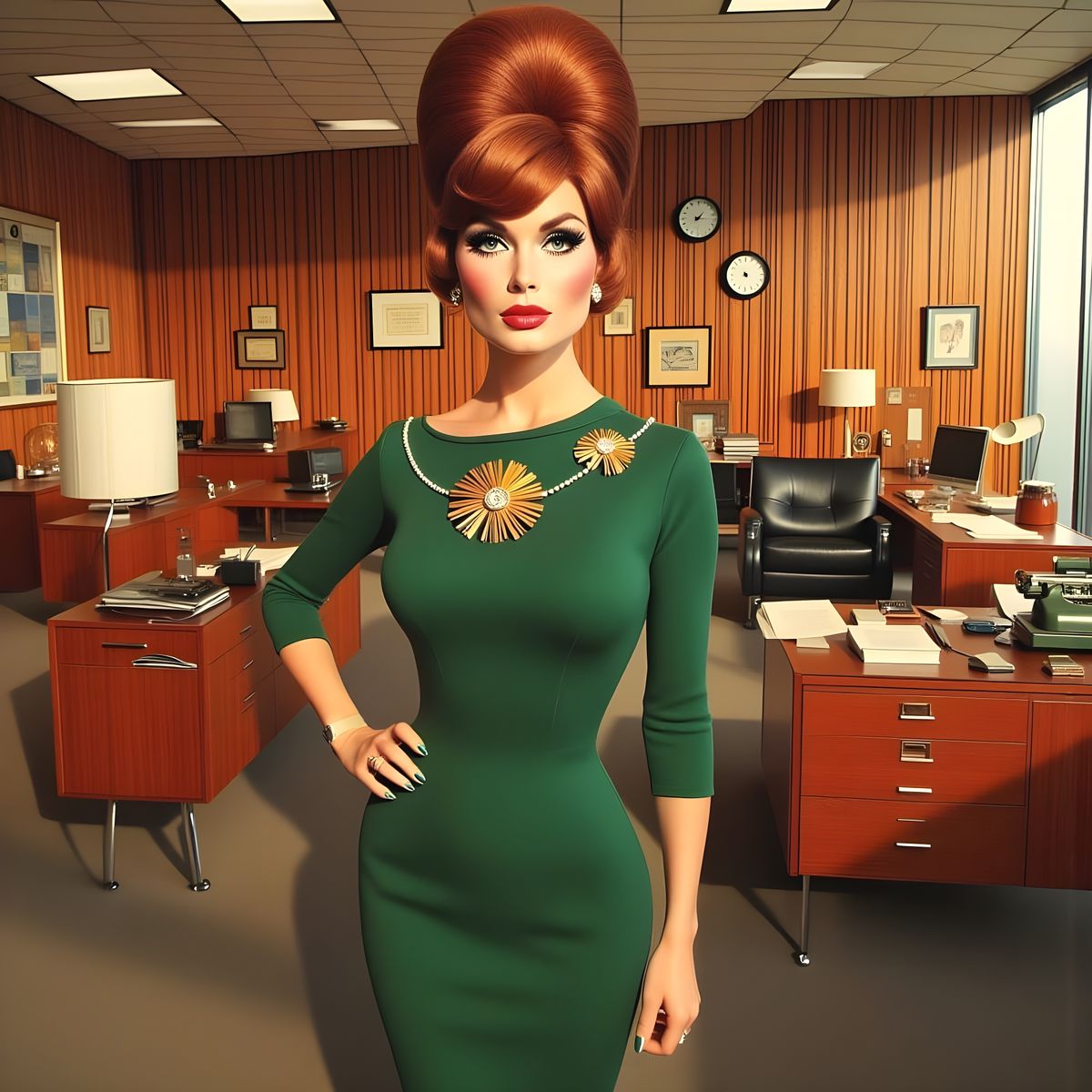 This image shows a glamorous secretary in a 1960s office setting. The portrait is done in an expressionist impasto style, emphasizing bold colors and textures, capturing a vintage aesthetic.