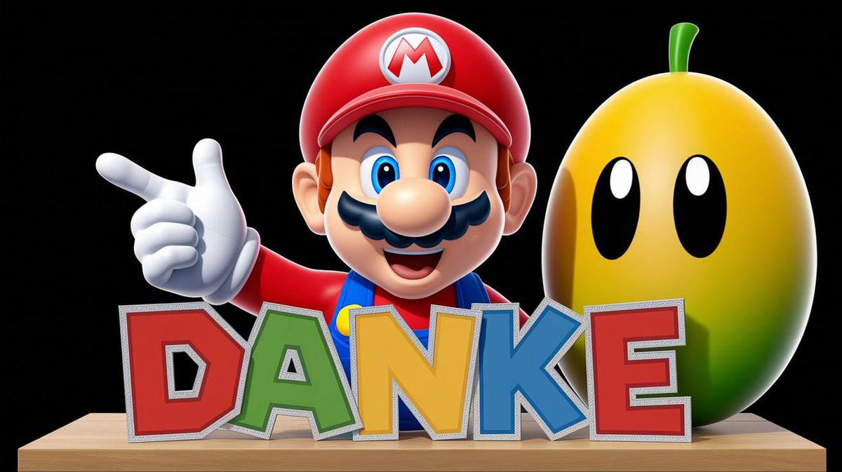 A stunning digital portrait of Mario surrounded by vibrant elements, including a giant maracuja and a sign with the letters 'DANKE', showcasing exceptional dynamic lighting and lifelike details.