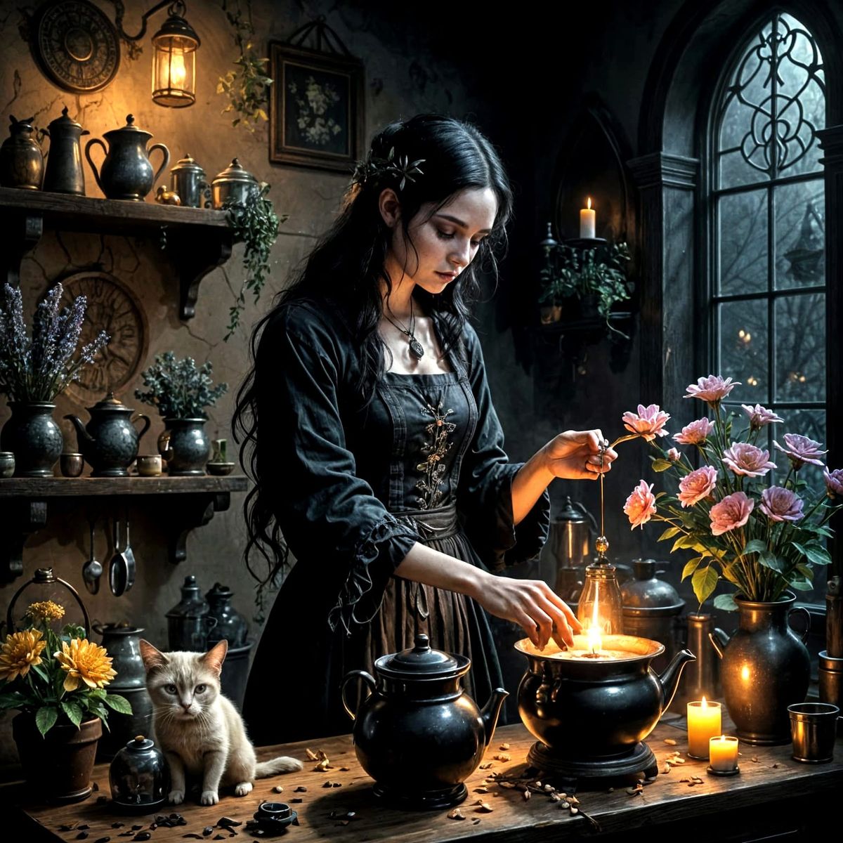 This image shows a woman brewing coffee in a dimly lit, apothecary-style kitchen. Hanging herbs and night flowers create a mystical atmosphere, with dramatic shadows and glowing botanicals.