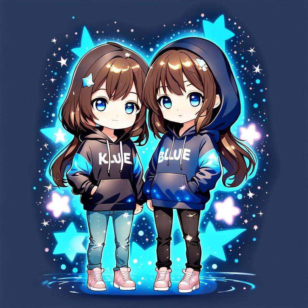 This image shows two cute chibi-style girls with matching brown hair and blue eyes, standing side-by-side in a dark blue sparkly setting. The illustration is rendered in soft pastel colors with delicate linework, in a kawaii anime style.