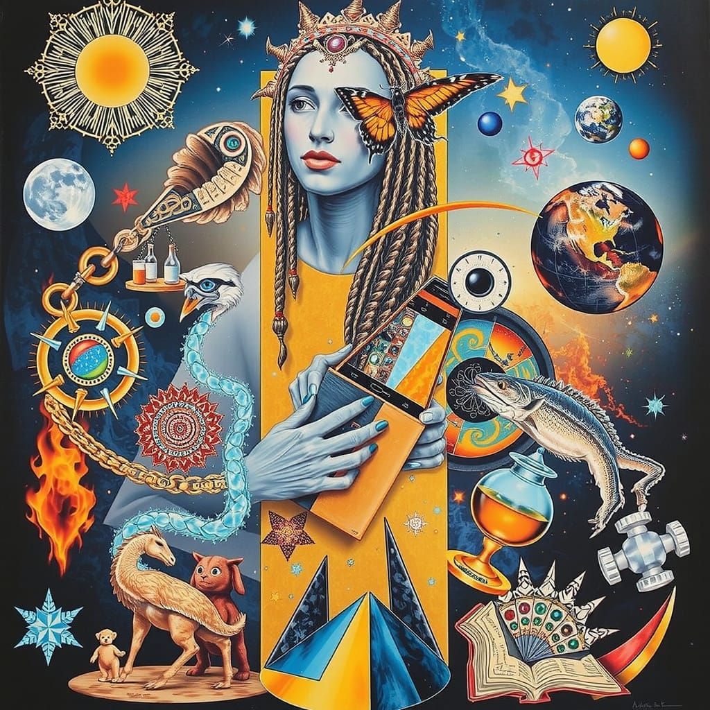 This image shows an abstract and colorful display of scientific and philosophical fields. The composition blends elements of cosmology, geology, anthropology and other disciplines in a surreal manner.