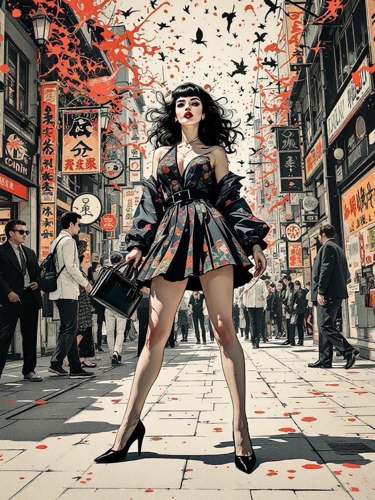 This image shows a 1950s-style pin-up woman standing on a busy city sidewalk. The artwork blends traditional Japanese scroll art with surreal ink chaos.