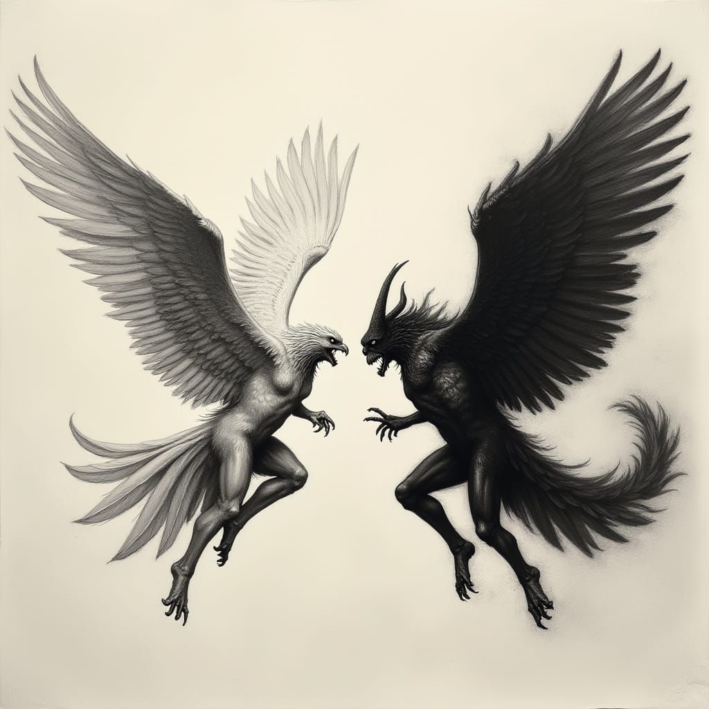 A striking image of a winged angel in a fiery, Icarus-like pose, locked in combat with a demonic devil possessing sharp, raven-like wings. Both figures are in a state of free fall, their faces twisted in anguish and rage. The angel wears a flowing white robe, while the devil sports a dark, smoky cape. Th...