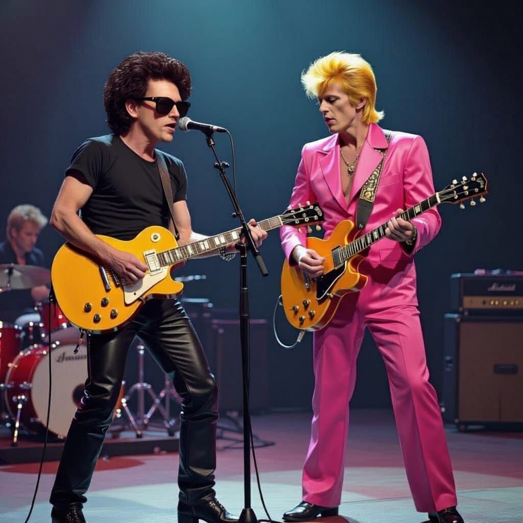 This image captures Lou Reed and David Bowie performing together on stage in 1984, rendered in the distinct style of a Norman Rockwell painting.