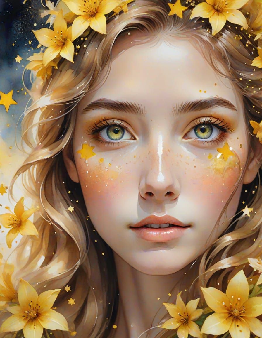 This image showcases a woman's face with sparkling topaz eyes surrounded by delicate flowers and twinkling stars, created in a soft watercolor style with subtle texture and warm, dreamy lighting.