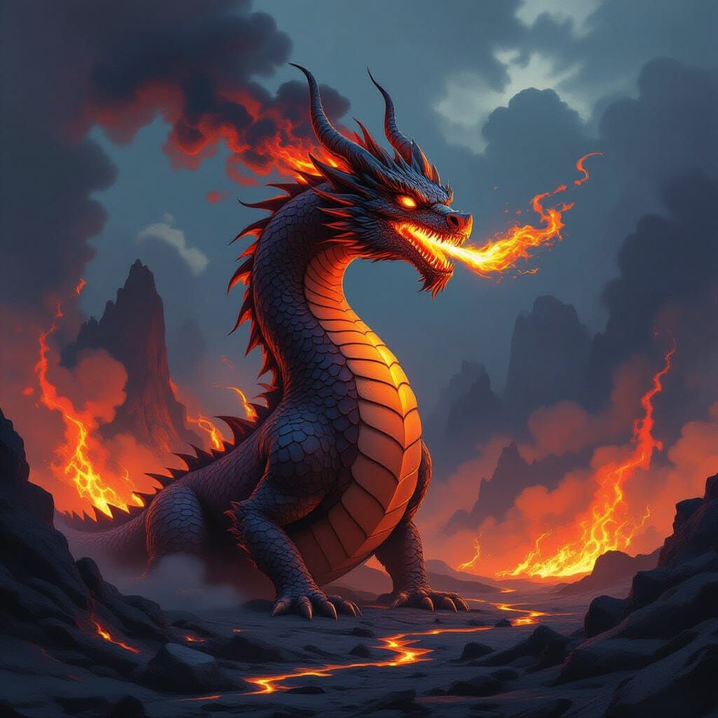 A stunning image shows a fire dragon in a volcanic landscape, breathing flames and surrounded by rivers of fire. The dragon's scales glisten like molten lava, in an industrial-fantasy aesthetic.